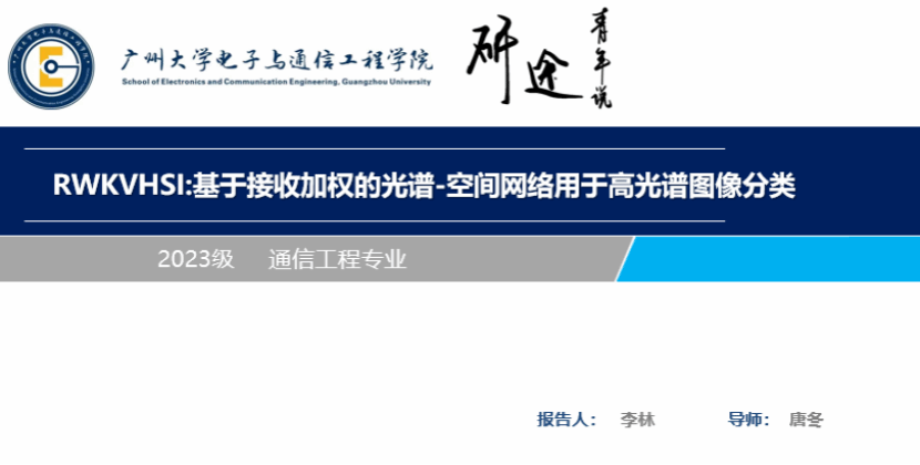 李林同学汇报的主题是RWKVHSI:基于接收加权的光谱-空间网络用于高光谱图像分类,他的讲解主要包含以下5个部分:研究背景与动机、RWKV模型概述、模块结构解析、实验结果、总结与未来工作。本工作聚焦高光谱图像(HSI)分类问题,系统阐述 RWKVHSI 模型的研究与应用。首先介绍 HSI“图谱合一”优势及维度高、光谱建模难等挑战,提出需轻量级且能建模长距离依赖的方案;接着解析RWKV模型核心机制,对比传统Transformer注意力,突出其Time Mixing与Channel Mixing模块线性复杂度优势;随后展示RWKVHSI双流结构(分离光谱/空间特征提取)及自适应融合机制;实验部分在Indian-Pines、Houston2013等数据集验证,模型OA、AA、Kappa指标均优于2D-CNN、ViT等方法,且计算开销低;最后总结模型优势,提出跨模态扩展、自监督学习等未来方向。