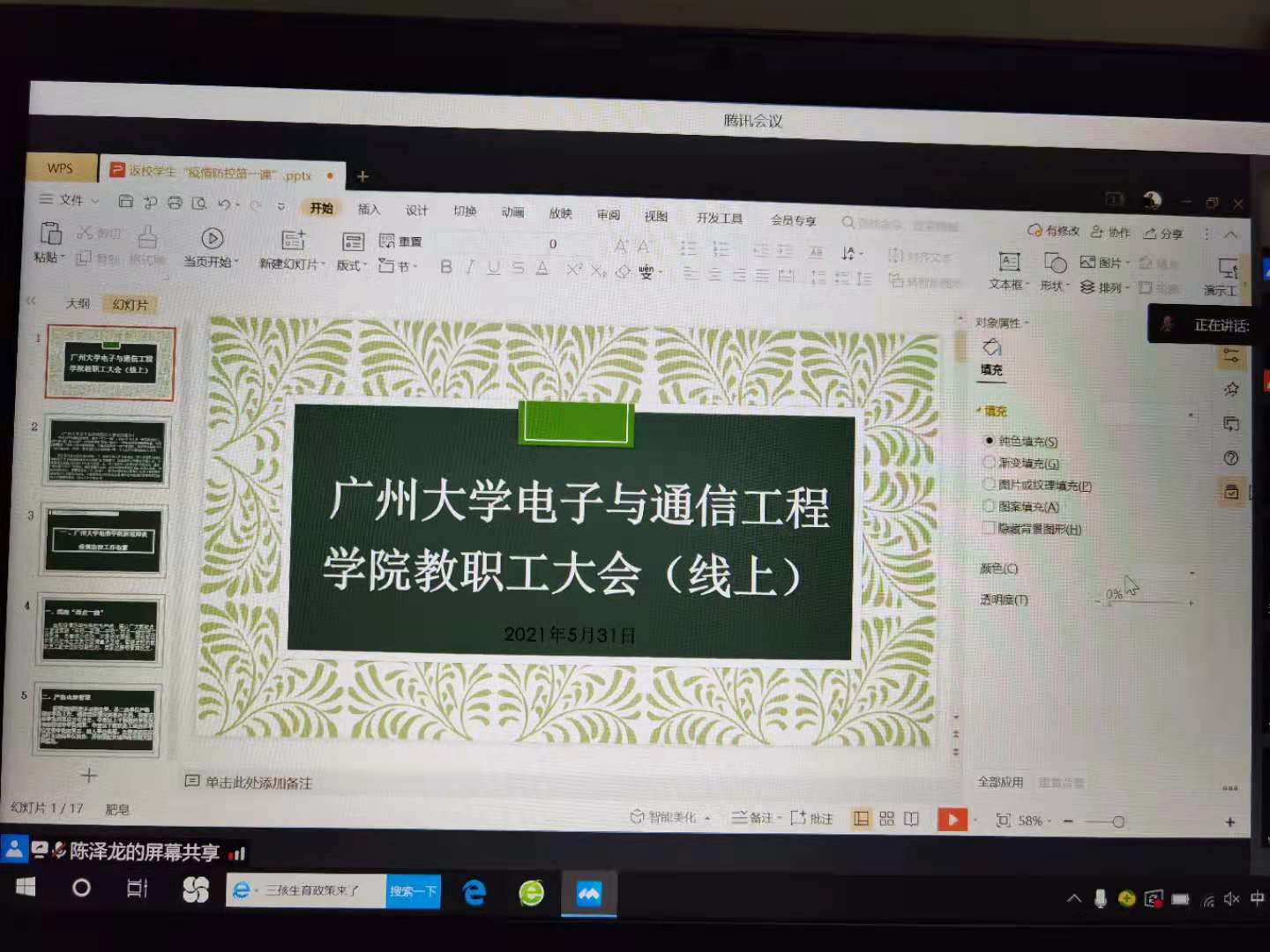 召开校园防疫、安全工作布置及学生就业工作线上会议,全体教职工参加了会议,会议由学院党委书记陈泽龙主持。
