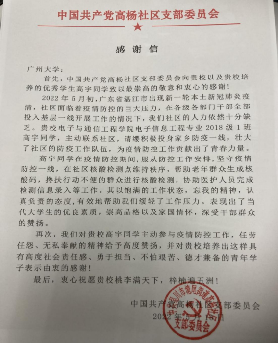 收到中国共产党吴川市塘尾街道高杨社区支部委员会关于表扬学校培养的优秀学生高宇的感谢信。高宇是成人短视频